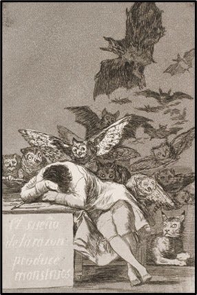 There is an etching by Spanish painter Francisco Goya titled, “El Sueño de la Razón Produce Monstruos”. The textbooks remember it as “The Sleep of Reason Produces Monsters”. Owls rest on a man deep in an exhausted slumber, lying in an ungainly equipoise. As darkness engulfs the rest of their parliament, the noble birds retreat into chthonic shadows; the man’s consciousness seemingly the only thing restraining the birds from a demonic transubstantiation. Understood in this light, the work is of a piece with traditional narratives about the ennobling force of the enlightenment.